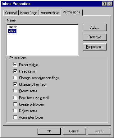Выберите папку в Списке Папок Outlook и затем, используя элемент меню Properties, откройте диалоговое окно Свойства. Откройте панель Permission: